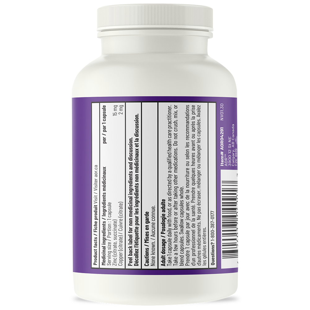 Medicinal ingredients (per capsule): zinc (citrate, succinate) 15 mg, copper (citrate) 2mg