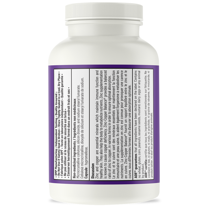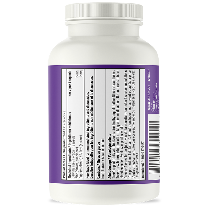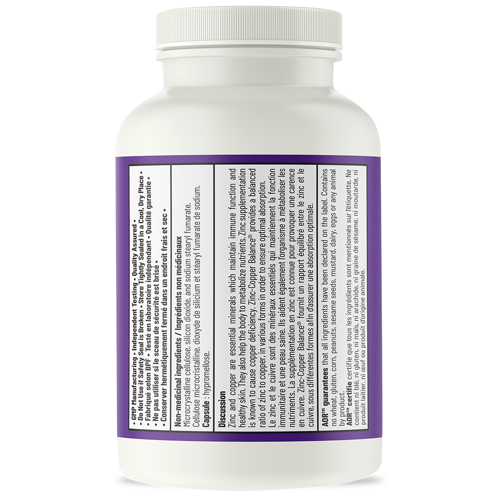 Although the importance of zinc is increasingly recognized, the crucial role of copper in our health has often been overlooked. However, excessive zinc supplementation alone can lead to a copper deficiency, which can have serious consequences for your long-term health. Zinc-Copper Balance® is the best choice for anyone taking a zinc supplement or looking for a balanced and varied formula containing these two essential minerals. AOR's Zinc-Copper Balance® provides a research-based and balanced zinc-copper ratio, each in different forms to ensure optimal absorption and function.