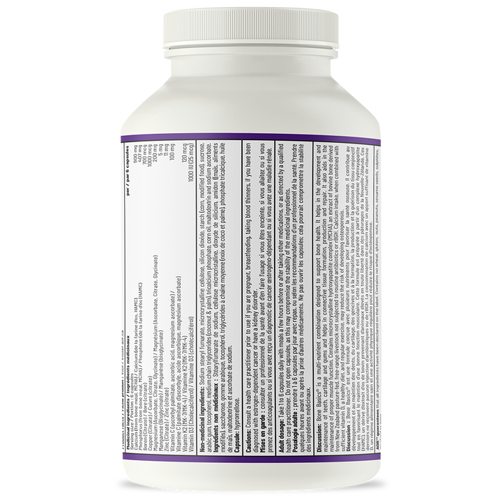 Medicinal ingredients (per 6 capsules): calcium (from bone meal, MCHC) 900 mg, phosphorus (from bone meal, MCHC) 407 mg, boron (citrate) 700 mcg, copper (citrate) 1000 mcg, magnesium (ascorbate, citrate, glycinate) 200 mg, manganese (bisglycinate) 5 mg, zinc (citrate) 11 mg, vitamin C (ascorbic acid, magnesium ascorbate) 100 mcg, vitamin K2 (MK-7/MK-4) 120 mcg, vitamin D3 (cholecalciferol) 1000 IU (25 mcg).