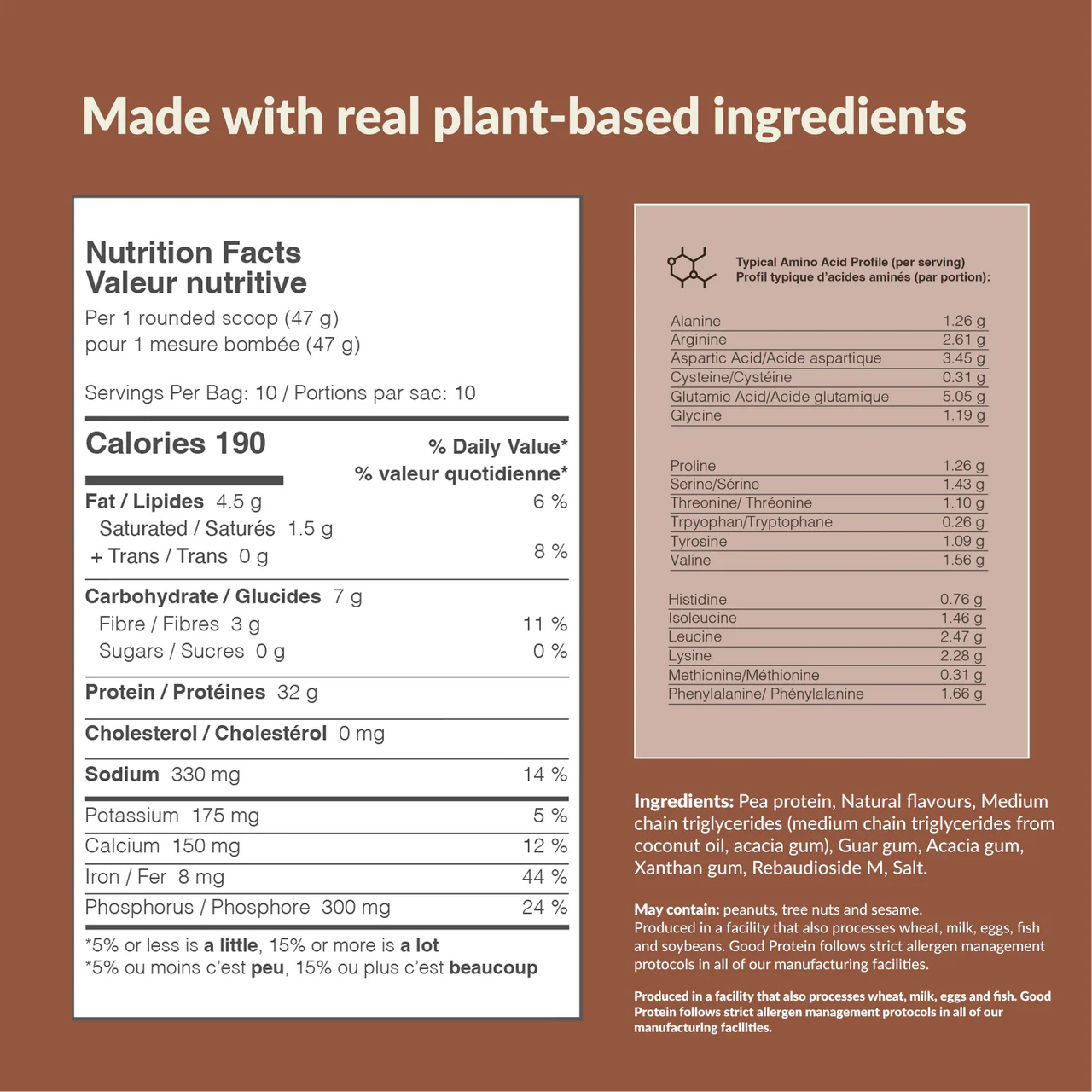 May contain: soybeans, peanuts, tree nuts, and sesame. Produced in a facility that also processes wheat, milk, eggs and fish. Good Protein follows strict allergen management protocols in all of our manufacturing facilities.