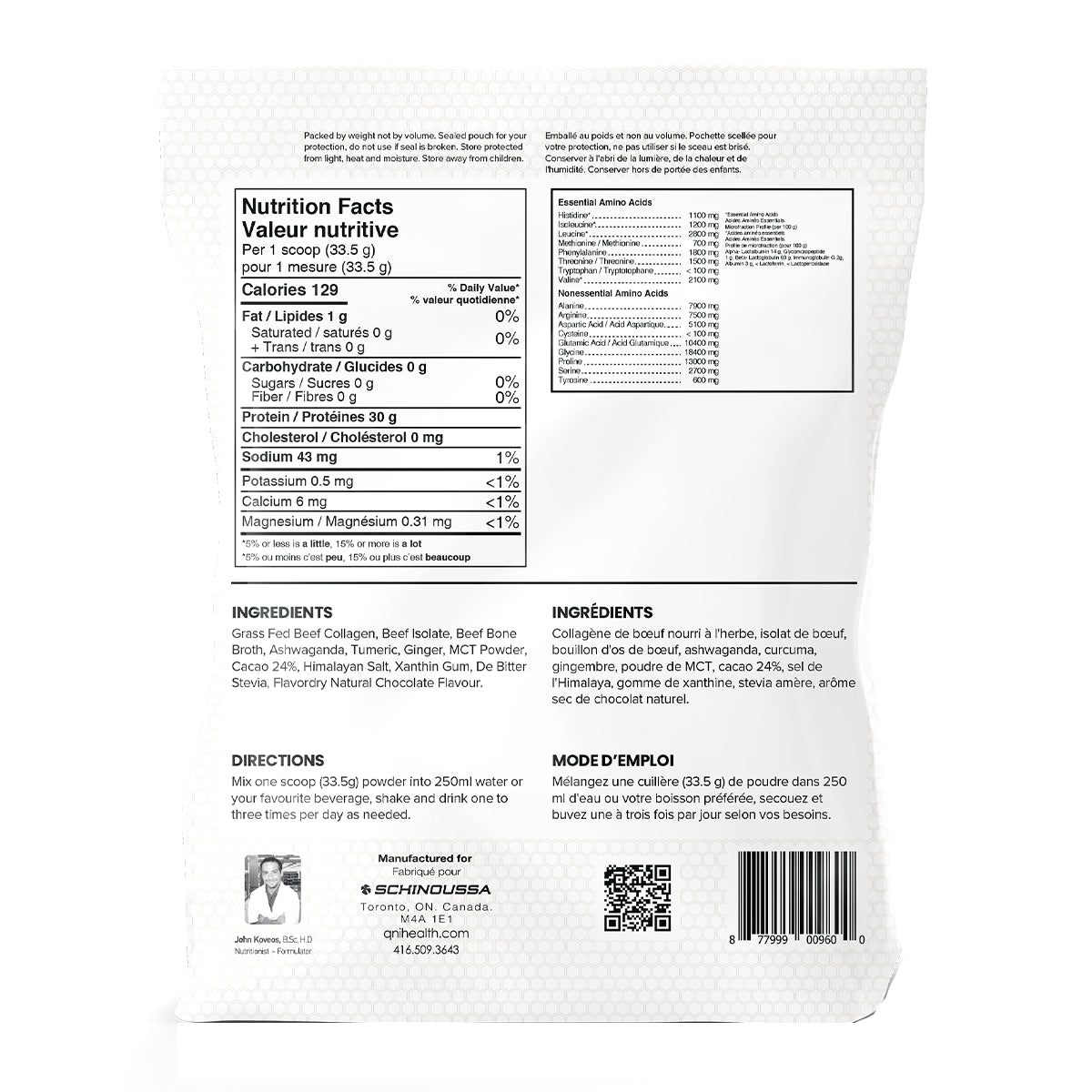 Grass Fed Beef Collagen, Beef Isolate, Beef Bone Broth, Ashwaganda, Tumeric, Ginger, MCT Powder, Cacao 24%, Himalayan Salt, Xanthin Gum, De Bitter Stevia, Flavordry Natural Chocolate Flavour.