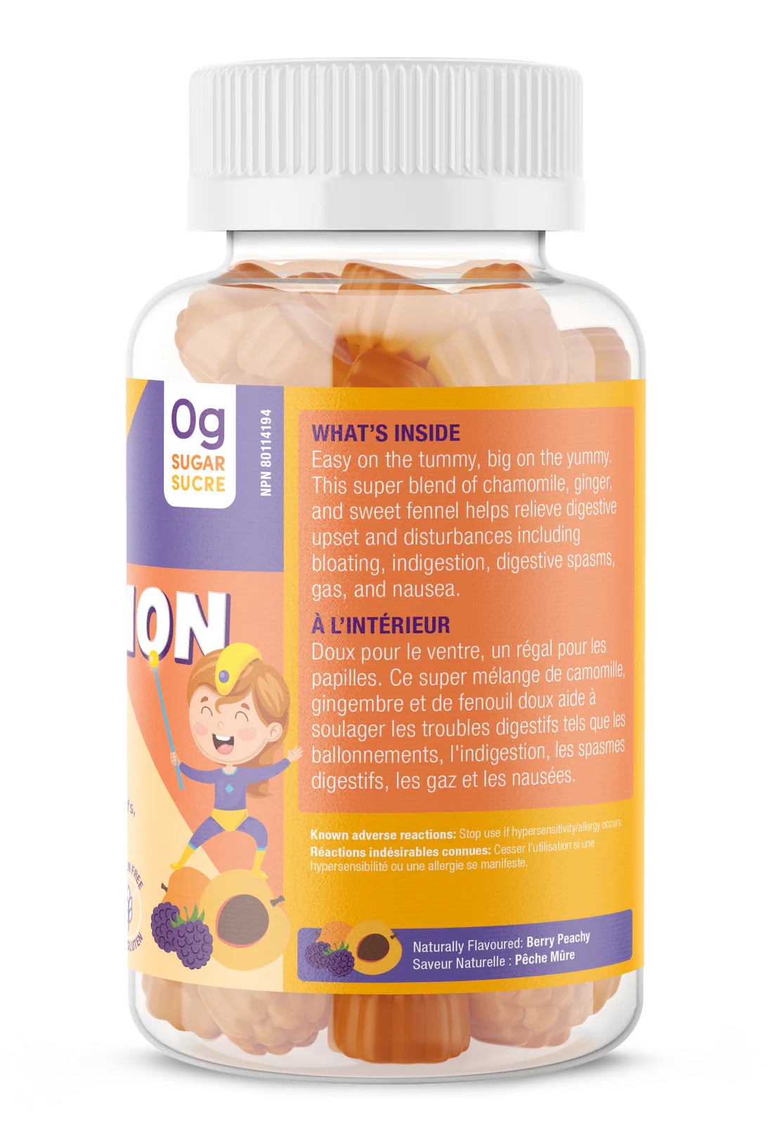 Non-medicinal Ingredients: Tapioca syrup, Water, Fruit flavour (Natural), Agar, Pectin, Citric acid, Sodium citrate dihydrate, Stevia leaf extract, Medium chain triglycerides, Carnauba wax